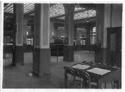 Abstract: Fotografia in bianco e nero con bordini bianchi. Merano. La sala deserta dell' interlocuzione-delle parti/stanza degli sportelli al piano terra dell'uff. postale e telegrafico, costruita nel 1913 secondo un progetto di Friedrich Ohmann.