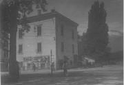 Abstract: Fotografia in bianco e nero. Merano-Maia Bassa. Il vecchio Kadergebäude (bzw/risp. Cadregebäude) all'incrocio Reichstrasse/Franz Ferdinand-Kai odierna via Roma/viale delle Terme).