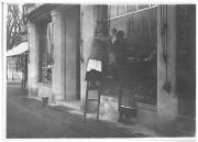 Abstract: Fotografia in bianco e nero con bordini bianchi. Merano. Passeggiata d'Inverno. Le sorelle Hromadka "Prima impresa di pulizie meranese", lucidano le vetrine della gioielleria A. Frühauf sulla Passeggiata d'Inverno.