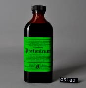 Abstract: Braune Enghalsflasche (EURO Med-Flasche) mit rotem Schraubverschluss für Protonicum, feinschmeckendes Stärkungsmittel. Boden mit geriffeltem Standring und leicht nach oben gewölbt. Bodenprägung. Vorgedrucktes selbstklebendes Etikett mit Logo der Stadtapotheke in Brixen. Auf halbrundem, grünem Grund Produktname schwarz eingedruckt. Rückseite Etikett mit Herstellungsdatum, Verbrauchsdatum, Preis und Barcode.