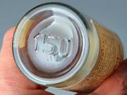 Abstract: Runde, farblose Glasflasche, mit Bindfaden gesicherter Korkstopfen. Standring geriffelt, Boden leicht eingewölbt mit aufgeprägtem Sonnensymbol. Mündung ausgebogen. Runde Schulter. Seitennaht. Signiert. Enthält Kräuterhaarwasser