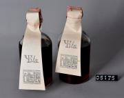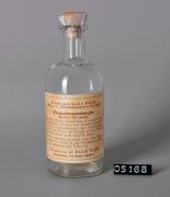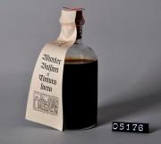 Abstract: Runde, farblose Enghalsflache mit langem Hals, ausgebogener Mündung, seitlicher Naht und Korkstopfen. Boden leicht eingewölbt mit Standring. Eingeprägte Volumenangabe am Flaschenboden. Vorgedruckts Etikett der Stadtapotheke Peer. Rückseite Preisschild.