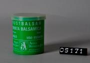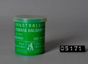 Abstract: Grüne Salbenkruke aus Kunststoff mit Schnappdeckel, enthielt Brustbalsam für Erwachsene. Weiß bedruckt. Auf der Rückseite selbstklebendes Schild mit Barcode, Inhaltsangabe Chargennummer und Hersellungsdatum.
