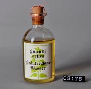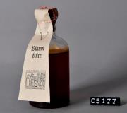 Abstract: Runde, farblose Glasflasche mit Korkstopfen. Standring geriffelt, Boden leicht eingewölbt mit Sonnensymbol als Prägung. Mündung ausgebogen. Runde Schulter. Seitennaht. Beschriftung mittels Rezeptfahne. Enthält Tinctura Aloes composta (Med Ed VI)