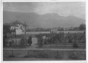 Abstract: Merano. Fotografia in bianco e nero raffigurante un corteo funebre lungo la strada per il cimitero comunale. Sullo sfondo è visibile uno scorcio dell'Hotel Bellevue.