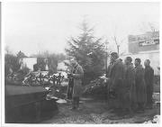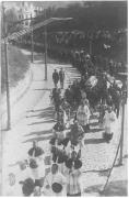 Abstract: Fotografia in bianco e nero con bordini bianchi. Cimitero di Merano. Funerale di Fritz Gritsch. Il corteo é aperto da studenti con ghirlande.