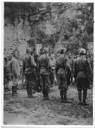Abstract: Fotografia in bianco e nero con bordini bianchi. Merano. Piazza Duomo. K.u.k. soldati prima del servizio funebre del defunto imperatore Franz Josef I.