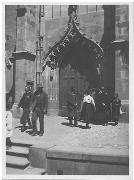 Abstract: Fotografia in bianco e nero con bordini bianchi. Merano. Piazza Duomo. Gruppo di persone davanti al portone d'ingresso della chiesa. Sul retro immagine, un'annotazione scritta a matita.