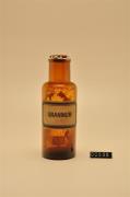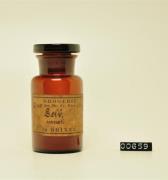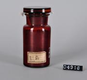 Abstract: Rundes, braunes Pulverglas mit Schlifftopfen. Verdickter, abgeflachter Mündungsrand. Etikettiert