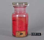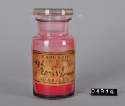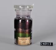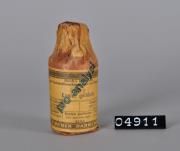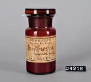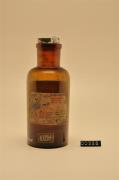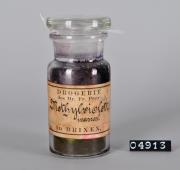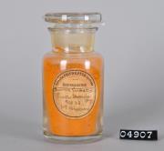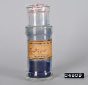 Abstract: Rundes, farbloses Pulverglas mit Schliffstopfen. Hohlstopfen mit Hefteisenabriss. Ausladender, abgeschrägter Mündungsrand. Mit Signierapparat bedrucktes und mit Schilderlack überzogenes Papierschild, achteckig, mit rotem Rand und schwarzer Schrift auf ehemals weißem Grund.