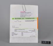 Abstract: Bodenfaltsack aus weißem Papier. Innen blaues Pulver im Cellophansack. Etikette der Apotheke zur Triumphpforte in Innsbruck. Geprüft vom Kontroll-Labor Mag. Kottas. Italienische Chargenetikette der Stadtapotheke Peer.