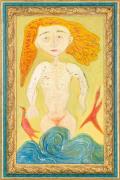 Abstract: È rappresentata una figura sú uno sfondo giallo ocra. Sui lati due uccelli rossi ed al centro un'onda verde che copre le gambe della figura.