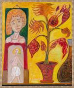 Abstract: Sono rappresentate sulla parte destra due vasi: uno vuoto e visibile solo a metà e l'altro contiene una pianta e sul vaso si riconosce un volto. Vasi e pianta sono in rosso porpora. Sulla parte sinistra del dipinto c'è un quadro con due figure femminili.