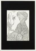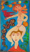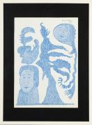 Abstract: Sono rappresentate due persone, la donna seduta sulla testa dell'altra. Intorno alle figure ci sono ornamenti ed forme animalesche. Lo sfondo è blù.