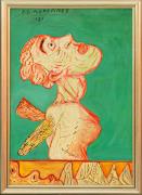 Abstract: Al centro del dipinto é rappresentato un busto di una figura in profilo, in basso c'è un ornamento e lo sfondo è verde. La figura sembra sovrumana, sulla schiena ha due piccole ali.