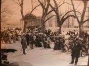 Abstract: Fotografia, b/n (riproduzione) - Merano - Passeggiata. Gruppo di persone mentre assistono a un concerto alle Terme; sullo sfondo, il padiglione della musica. Didascalia: "La passeggiata durante un concerto termale".