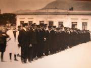 Abstract: Fotografia bianco/nera, inerente Merano: portieri (facchini?) di varie strutture alberghiere davanti alla stazione, pronti ad accogliere gli ospiti in arrivo.