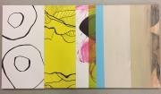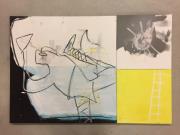 Abstract: Trovano tutti i miei pensieri posto sotto l’acero In questo ciclo di opere Yvonne Gienal si ispira alle illustrazioni del grigionese Alois Carigiet. I suoi quadri sono suddivisi in settori nei quali la pittura classica incontra elementi grafici, e il graffitto a spruzzo si affianca alla pittura a campi di colore monocromatici. - 2. quadro: colori chiari (bianco, grigio, giallo, azzurro), schizzi di una figura umana, una scala e il sole