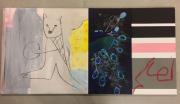 Abstract: Trovano tutti i miei pensieri posto sotto l’acero In questo ciclo di opere Yvonne Gienal si ispira alle illustrazioni del grigionese Alois Carigiet. I suoi quadri sono suddivisi in settori nei quali la pittura classica incontra elementi grafici, e il graffitto a spruzzo si affianca alla pittura a campi di colore monocromatici. - 3. quadro: schizzo di un animale sù sfondo grigio, dipinto di un pavone sù sfondo nero, righe orizzontali in nero, bianco, rosa, grigio
