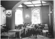 Abstract: Fotografia, b/n, Colle Isarco, Palasthotel (Hotel Palace), sala da pranzo.