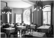 Abstract: Fotografia, b/n, Colle Isarco, Palasthotel (Hotel Palace), sala da pranzo con lampadari pendenti (ciascuno, con 6 e 10 lampade).