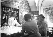 Abstract: Fotografia, b/n, Colle Isarco, Palasthotel (Hotel Palace), bar con barista e ospiti (1 uomo e 2 donne) seduti al bar.