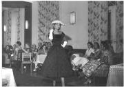 Abstract: Fotografia, b/n, Colle Isarco, Palasthotel (Hotel Palace), sfilata di moda; modella al centro dell'immagine con spettatori laterali.