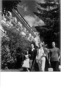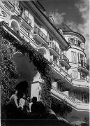 Abstract: Fotografia, b/n, formato verticale, Colle Isarco, Palasthotel (Hotel Palace); vista esterna con ospiti.