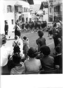 Abstract: Fotografia, b/n, formato verticale, Colle Isarco, parata con banda, vivandiera e spettatori a bordo strada.