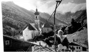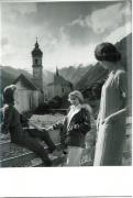 Abstract: Fotografia, b/n, formato verticale - Colle Isarco. L'immagine, raffigura tre donne con la chiesa parrocchiale di Colle Isarco sullo sfondo.