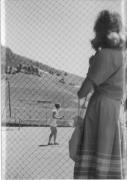 Abstract: Fotografia, b/n, formato verticale - Colle Isarco - campo da tennis. Una donna in campo con racchetta da tennis e una donna (spettatrice), in piedi, dietro la rete metallica, sul bordo destro dell'immagine (di spalle).