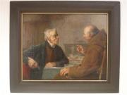 Abstract: Dipinto ad olio su legno. Sono mostrati un impiegato e un prete seduti uno di fronte all'altro a un tavolo e che parlano tra loro.