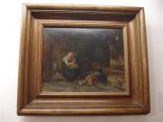 Abstract: Dipinto ad olio su tela. Nella riquadro una ragazza nella cucina della fattoria che da da mangiare alle galline. Accanto a lei si puo' vedere: il camino aperto, vari utensili da cucina, un armadio e una brocca.