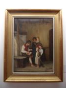 Abstract: Dipinto ad olio su legno. Viene mostrato un giovane suonatore di cetra seduto sulla panca della stufa, che suona una canzone per gli altri quattro bambini.