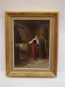 Abstract: Dipinto ad olio su tela con uno spaccato della stanza con il letto di morte e il corpo della prima moglie dell'artista Annamaria Sanoner. Ci sono due persone in lutto nell'anticamera.