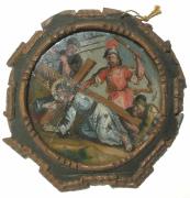 Abstract: Hinterglasbild mit der Darstellung Christi als Kreuzschlepper. Motiv: Christus ist unter der Last seines Kreuzes zu Boden gesunken. Er trägt ein blau-graues Gewand und eine Dornenkrone auf den Haupt. Ein Soldat im roten Gewand treibt ihn mit dem Knüppel an. Ein weiterer im Hintergrund schleppt die Lanze und das Kreuz. Hinter dem Kreuz hilft ein Mann Christi das Kreuz wieder aufzuheben. [Mehrere Glasbrüche, fragmentierter Rahmen] Rahmen: gekerbte Doppelprofilleiste (original).