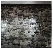 Abstract: Diversi strati semitrasparenti di pellicola (celluloide) impressionata su pannello in legno con vari motivi in bianco e nero.