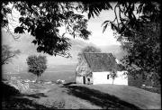 Abstract: Fotografia in bianco e nero con bordini bianchi raffigurante il Gasthof/locanda "Station Vigiljoch" con ospiti sulla terrazza (a sx).