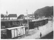 Abstract: Fotografia in bianco e nero con bordini bianchi. Lana. Rete tramviaria. Il tram presso la stazione di Lana di Sopra. S'intensifica il movimento.