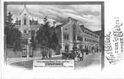 Abstract: 1 Postkarte, farbig (koloriert), gelaufen, Meran, Grand Hotel Meranerhof nach einem Aquarell von F.A.C.M. Reisch, Meran. Datierung 1912. Motiv: Spaziergänger vor dem Gebäude, auf dem Dach des Hauses wehen mehrere Fahnen. Nr. 448 "Kunstverlag Reisch Meran"