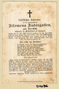 Abstract: Sterbebild von Filomena Andergassen geb. Pernstich, Bäuerin in Mitterdorf zu Kaltern Geb. am 13.07.1849 in Mitterdorf bei Kaltern, gest. am 24.07.1882 ohne Foto