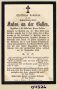 Abstract: Sterbebild von Anton an der Gassen, Expositus in St. Nikolaus, Pfarre Kaltern Geb. am 10.05.1818 in Kaltern, gest. am 10.09.1888 ohne Foto
