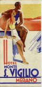 Abstract: Opuscolo pubblicitario: "Hotel Monte S. Vigilio Merano". Motivo grafico basato su un disegno di Franz Lenhart; raffigura una coppia, un uomo abbronzato e una donna in abiti estivi.