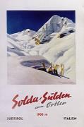 Abstract: 2 manifesti pubblicitari di Solda sull'Ortles a 1900 m. Motivo: baita innevata con sciatori. Disegno di Franz Lenhart, del 1960