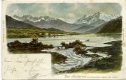 Abstract: 1 cartolina postale, a colori, viaggiata, Lago di San Valentino alla Muta in Val Venosta. Motivo: veduta del lago e di alcuni edifici sulle rive del lago verso il massiccio dell'Ortles, secondo un dipinto di F. A. C. M. Reisch. Il logo "Autochrom" si trova sul bordo destro dell'immagine.