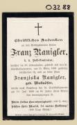 Abstract: Sterbebild von Franz Ranigler, k.k. Post-Controlor Gest. am 15.03.1893 im 60. Lebensjahr ohne Foto Sterbebild von Franziska Ranigler geb. Wallnäfer Gest. am 18..07.1890 im 46. Lebensjahr ohne Foto
