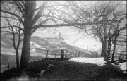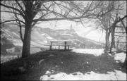 Abstract: "Kurtatsch vom Altlehen gesehen" Schneebedeckte Landschaft, Tisch und Bank zwischen zwei Bäumen, im Hintergrund Kurtatsch umgeben von Weingärten