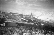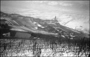 Abstract: "Ausblick vom Altlehen auf Kurtatsch" Schneebedeckte Weingärten, Kurtatsch im Hintergrund das Etschtal