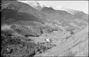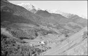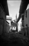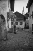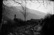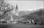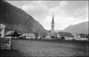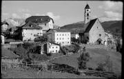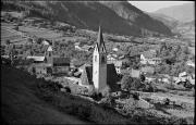 Abstract: "Sankt Georgen in Richtung Tauferertal einwärts"; Der Ortskern von St. Georgen mit Kirche und Kirchturm im Jahr 1931, umgeben von Gebäuden, in Richtung Norden aufgenommen; von links nach rechts das alte Schulhaus sowie die Höfe Reaser und Brugger, vor Brugger die Friedhofskapelle, vor der Kirche Bartlmayr, dann Widum und rechts Hanslmayr, dazwischen Rader, im Hintergrund links der St. Georgener Kofel gegen den Sambock, rechts Berge der Rieserfernergruppe, mittig Berge der Venedigergruppe.