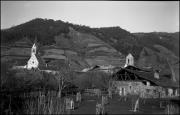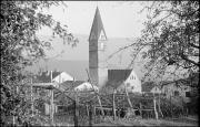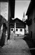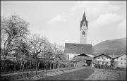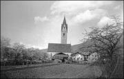 Abstract: Pfarrkirche zur Heiligen Katharina und Kirchturm mit originellem Abschluss mit Oktogon, Eckzipfeln und Haube und Friedhofskapelle in Aufhofen (Gemeinde Bruneck) im Jahr 1931, in Richtung Norden aufgenommen; rechts im Vordergrund Lang und dahinter Winkler, links hinter der Kirche Messner und Heidacher, dahinter die Dächer von Pfisterer und Ansitz Ansiedl, vorne Holzzaun und Bäume, im Hintergrund der St. Georgener Kofel gegen Scheibe und Rauchkopf und weitere Berge Richtung Ahrntal.